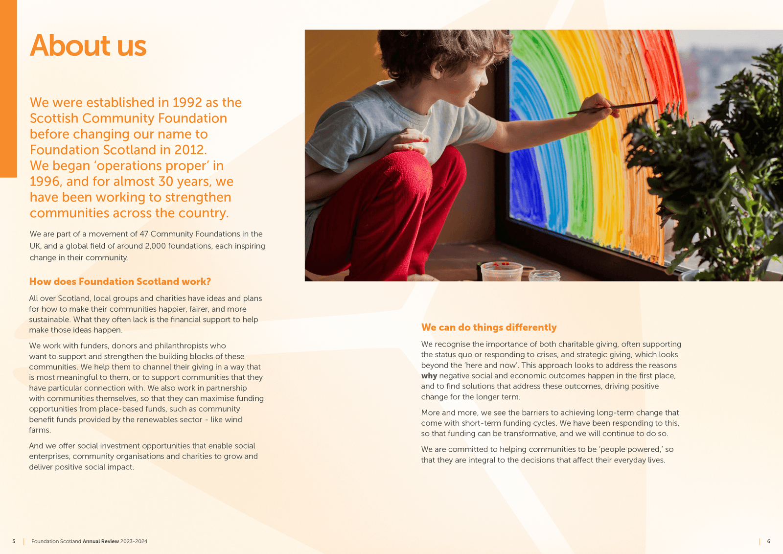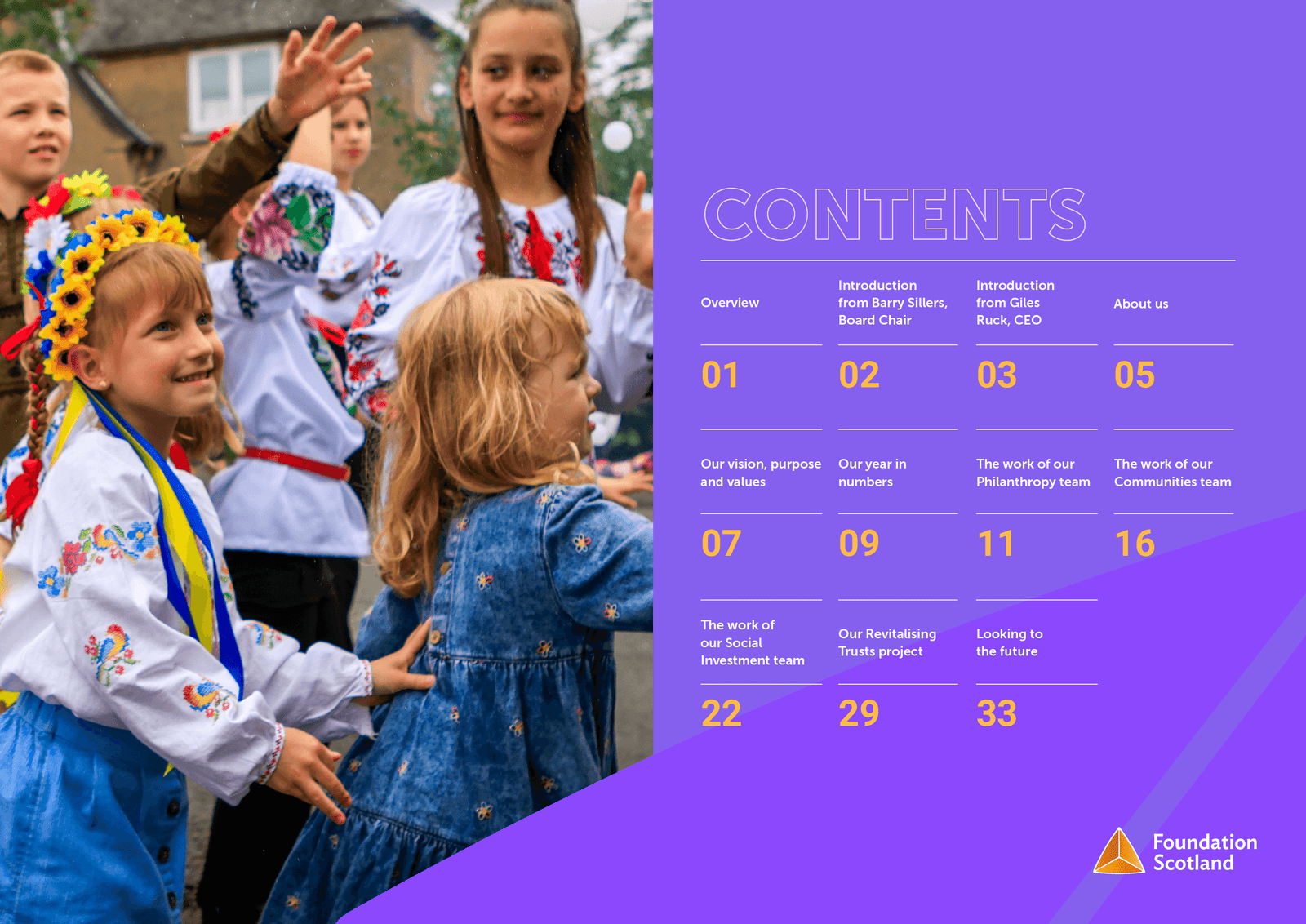 An example of a 2024 quarterly Foundation Scotland Flash Report, highlighting recent projects and news while showcasing funded initiatives with vibrant detail.