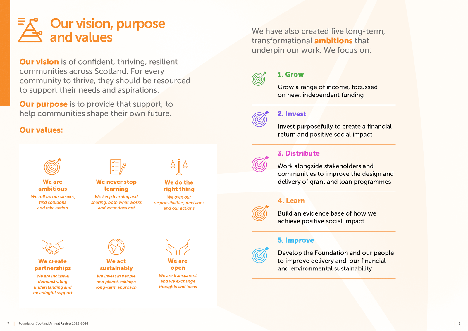 A selection of designed layouts for the recent Foundation Scotland Annual Report, highlighting their progress, learning and future aspirations. My aim was to visually showcase the impactful work of their funding initiatives, bringing their achievements to life through engaging, thoughtful and colourful design.