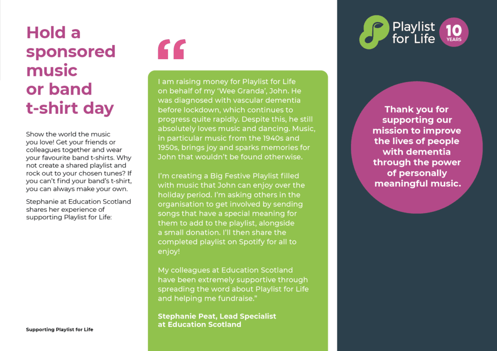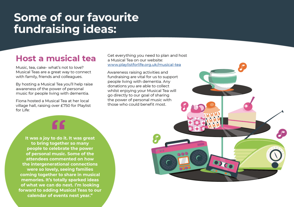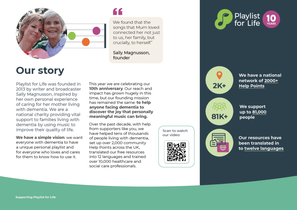 I designed this fundraising booklet for the dementia charity Playlist for Life, aimed at inspiring donors and supporters. The booklet combined engaging visuals with clear messaging to effectively communicate the charity’s mission and encourage contributions.